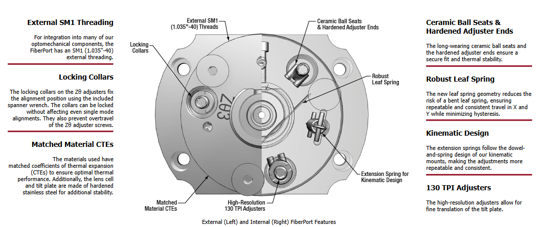 These FiberPorts include a dust cap, a 0-80 locking screw, a 0.028″ hex key for the locking screw, a 0.050″ hex key for the Zθ, X, and Y adjusters, and an SPW403 spanner wrench for the Zθ locking collars.