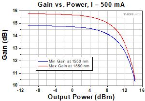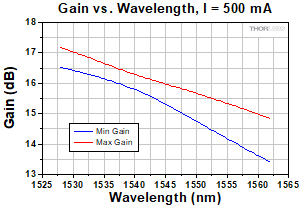 | Typical gain versus power plot for the SOA1013SXS optical switch/shutter at 500 mA. | Typical gain versus wavelength plot for the SOA1013SXS optical switch/shutter at 500 mA. |