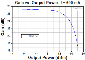 | Typical gain versus output power plot for the BOA1004PXS optical switch/shutter at 600 mA. |