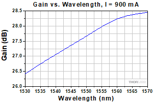 | Typical ASE LIV plot for the BOA1550PXS optical switch/shutter. | Typical gain versus wavelength plot for the BOA1550PXS optical switch/shutter at 900 mA. |
