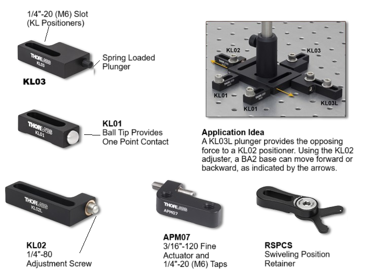 Our Spring-Loaded Plungers can be used to hold an object firmly against Kinematic Stops or an Adjustable Positioner. The high-strength plastic plunger on both the KL03 and KL03L applies spring pressure over a travel range of 0.25″ (6 mm). The plunger tension can be adjusted using a 5/32″ (4.0 mm) hex key. The KL03 is convenient to use in space constrained applications because it has a smaller slot and more compact design. The KL03L has a longer slot, capable of spanning two tapped holes at a 45 degree angle on an optical table. This allows the KL03L to be secured to a table using two cap screws, providing more stability and resistance against rotation in a system. In Figure G3.1, one KL03 plunger is used with two KL01 kinematic stops while one KL03L plunger is used with a KL02 adjustable positioner to translate a BA2 base back and forth along a line. On one side of the base, two KL01 stops define a reference edge. On the opposite side, the KL03 presses the base against the two stops and prevents it from moving in the direction perpendicular to the reference edge. Along the other edges, the KL03L plunger presses against a KL02 adjustable positioner. Without the KL03L, the KL02 could only push the base forward. However, in this setup, as the KL02 is retracted, the KL03L provides an opposing force that pushes the base back. |